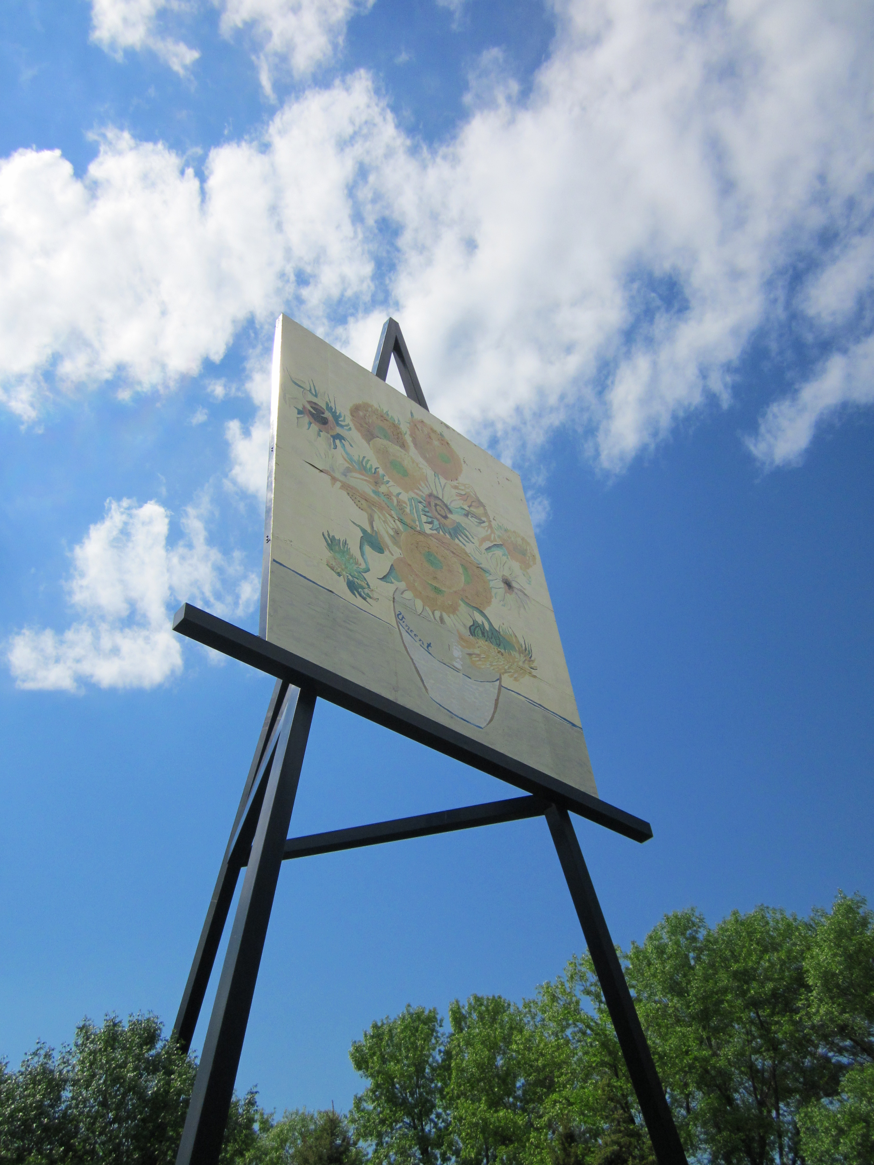 I drove up to Altona, Manitoba, site of one very tall Van Gogh Sunflower easel. It’s an installation that is part of a “democracy and art” project out here on the prairies.